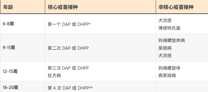 DAP 或 DAPP 疫苗最早可在六周龄时接种,之后每隔四周接种一次联合疫苗,直至至少 16 周龄。最后一次接种后 12 个月需要进行加强针注射。之后,美国心脏协会 (AAHA) 建议每三年或更长时间进行加强针注射。
