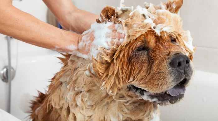 松狮犬在洗澡时用洗发水擦洗头部