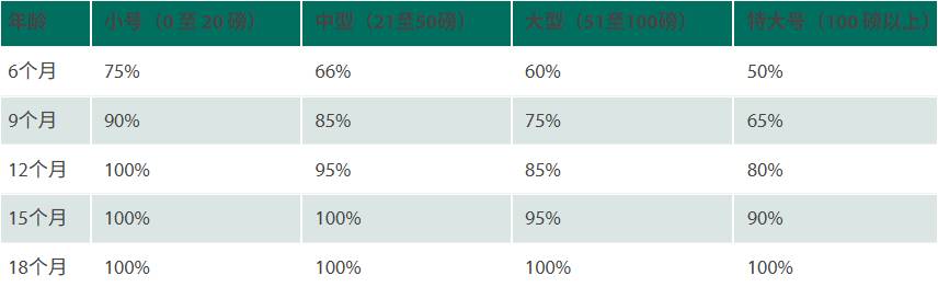 以下是幼犬在六个月及以上时体重应占成年体重的大约百分比,根据其体型分组。